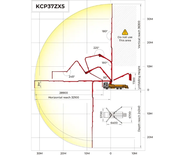 Ця модель є втіленням передових технологій. Її конструкція зорієнтована на максимальну ефективність та безпеку. Надійне шасі забезпечує стабільність навіть при повному розгортанні стріли, а продуктивність до 150 м³/год дозволяє заливати великі об’єми бетону за короткий час. Автобетононасос KCP 37ZX5150 — це інвестиція, яка окупиться завдяки високій продуктивності та надійності.