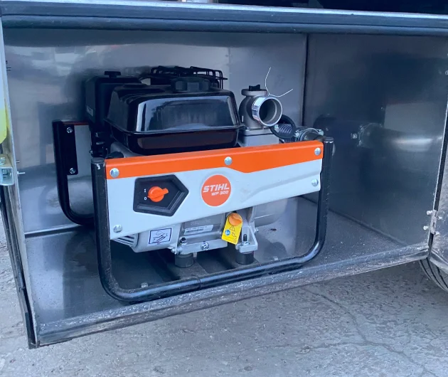 - Мотопомпа: Цистерна може бути оснащена бензиновою мотопомпою STIHL WP 300 для швидкого та ефективного перекачування води.