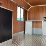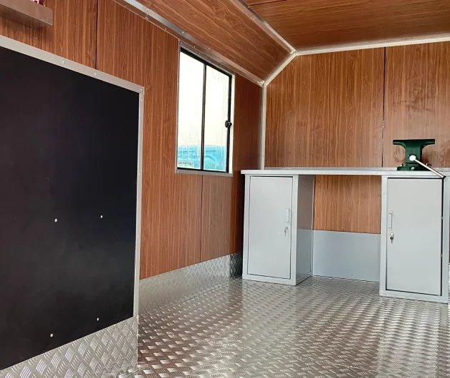 - Обшивка: Алюмокомпозитні панелі з утеплювачем пінополістеролом (40 мм), внутрішнє оздоблення — алюмокомпозитна панель з малюнком під деревину.