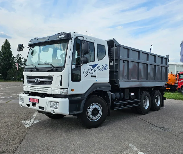 Самоскид Novus 6×4 оснащений перевіреною колісною формулою, яка забезпечує чудове зчеплення з ґрунтом та стабільність на нерівних дорогах і бездоріжжі. Кузов об’ємом 15 м³ виготовлений із високоміцної сталі, стійкої до абразивного зносу та ударних навантажень, що гарантує його довговічність навіть при транспортуванні щебеню чи скельних порід. Гідравлічна система підйому забезпечує швидке та надійне розвантаження, мінімізуючи час простою на об’єкті.